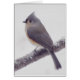 Cute Tufted Titmouse bird is geperst op een sneeuwtak tijdens de eerste sneeuw van het Winterseizoen in New Hampshire.