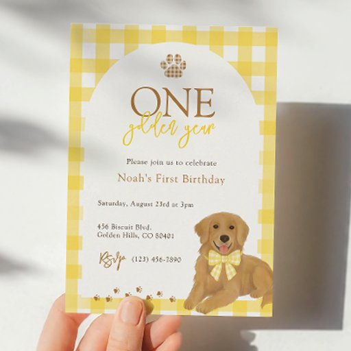 Vier het grote moment van uw kleine met deze leuke “One Golden Year” verjaardagsbanner met een gouden retriever puppy in een feesthoed, cupcakes, ballonnen en gele geruite accenten. Perfect voor een eerste verjaardag, deze banner maakt een zoete en feestelijke statement achter de dessert tafel of bij de ingang van het feest. Personaliseer met de naam van uw kind voor een hartverwarmend en fotogeniek feestdetail!