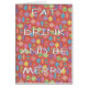 Eet drink en wees vrolijke kerstbegroeting in witte letters met kerstboomversieringen in blauw, groen, geel, paarse en roze met een rode achtergrond.