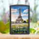 Een pittoresk uitzicht van de Eiffeltoren in het Franse Parijs, met een levendig bloemenveld op de voorgrond en een prachtige zonsopgang. De toren staat hoog tegen een achtergrond van donzige wolken, waardoor een magische en romantische scène ontstaat