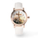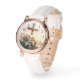 Cette image présente une montre à bracelet en cuir blanc et un coque en or rose. Le visage de la montre présente une scène sereine et pittoresque d'une croix en bois entourée d'un bouquet de fleurs, dressé contre un ciel doux et pastel. Les chiffres de la montre sont dans une police classique, ajoutant à l'élégance générale et l'attrait intemporel de la pièce. Cette montre n'est pas seulement un garde-temps fonctionnel mais aussi un art qui évoque un sentiment de paix et de tranquillité.