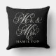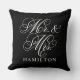 Elegant vierkant accent kussen voor gelukkige paren en newlyweds kenmerkt een wit manuscript Mr en Mrs. design met de tekst van het douanemonogram die met de getrouwde familienaam kan worden gepersonaliseerd. De zwarte achtergrondkleur kan worden aangepast om te coördineren met de decor-kleuren in uw woning of slaapkamer.