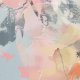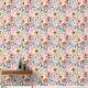 Elegant behang met gedempte roze, geel en oranje bloemenabstracts op een blauwe en salie groene achtergrond.