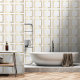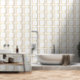 Stijlvol, elegant en glamoureus wit- en goudbehang met flinke glanzende gouden vierkanten die nauw verbonden zijn om een tegels-effect te produceren.