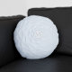 Een rond kussen voor je boudoir of leeshoek, een wit faux ruffle kussen met ruimte voor je initiaal