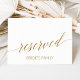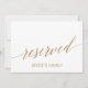 Dit elegante goudkalligrafie 'gereserveerd' bord is perfect voor een eenvoudige bruiloft. De kaart is dubbelzijdig (prints aan beide zijden). Het neutrale ontwerp is voorzien van een minimalistische kaart met romantische en faux gouden folie-typografie. Gebruik deze kaarten om stoelen of tafels te reserveren bij uw trouwceremonie, ontvangst of om het even welke gebeurtenis. Opmerking: dit ontwerp is niet voorzien van echte gouden folie. Het is een afbeelding van hoge kwaliteit die gemaakt is om op gouden folie te lijken.