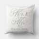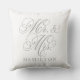 Elegant vierkant accent kussen voor gelukkige paren en newlyweds kenmerkt een pewter grijs manuscript Mr en Mrs. design met de tekst van het douanemonogram die met de getrouwde familienaam kan worden gepersonaliseerd. De witte achtergrondkleur kan worden aangepast om met uw huis of slaapkamer decor kleuren te coördineren.