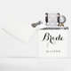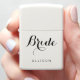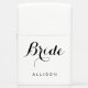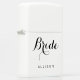Elegant Bride Script White Personalized Zippo Lighter Ontworpen met "Bride" in het klastige zwarte manuscript dat op de stevige witte steenaansteker wordt gecentreerd die door de naam van de bruid wordt gevolgd. Maakt een geweldig idee van een aangepast cadeautje.