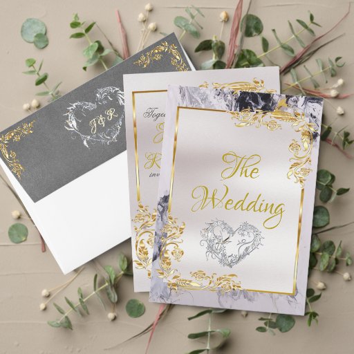 This elegant wedding announcement features a white satin center on a black and white marble background, framed with gold roses and leaves, embellished with a silver scroll heart. Designed to coordinate with the "Elegant Marble, Gold Leaves Frame & Scroll Heart" Wedding Collection. To change details, click «Personalize». To move the text or change the text size, font, or color click «Click to customize further»