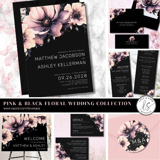 Elegant Modern Blush Roze Zwart Bloemen Bruiloft KaartElegant Modern Blush Roze Zwart Bloemen Bruiloft Kaart (Voorkant)Elegant Modern Blush Roze Zwart Bloemen Bruiloft Kaart (Achterkant)