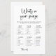 Geniet van je vrijgezellenfeest of vrijgezellenfeest met deze aanpasbare gamekaart! HOE TE OM TE SPELEN - geef elke gast een exemplaar van een lijst van alledaagse punten die vrouwen in hun portemonnee, zoals lippenstift, een telefoon, of een spiegel zouden kunnen dragen, en omvat sommige meer ongebruikelijke dingen om het spel interessanter te maken. - Elk punt zou een puntwaarde moeten hebben. - Elke gast moet door zijn portemonnee zoeken en hun punten ophelderen. - De speler met de hoogste score wint een prijs.