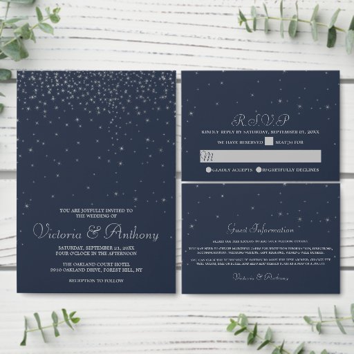 Elegant Navy & Silver Falling Stars Wedding Programma (Personaliseer de collectie van deze zelfstandige maker.)Elegant Navy & Silver Falling Stars Wedding Programma (Voorkant)Elegant Navy & Silver Falling Stars Wedding Programma (Achterkant)