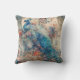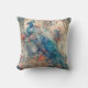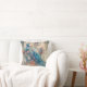 Een elegant decoratief kussen met een koninklijke pauw in de tinten blauw en perzik.