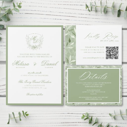 Designed with a soft ivory background, refined sage green border, and delicate botanical crest monogram, this design blends classic romance with natural greenery elegance. The graceful layout highlights your wedding date beautifully while coordinating seamlessly with your full stationery suite. Perfect for garden, outdoor, classic, and modern weddings, this save the date card creates a polished first impression for your celebration.