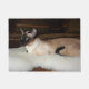 Slachtpunt Siamese kat houdt warm op een nepwol van witte lammeren en gooit deken op de bank. Ze legt zo met haar staart gekruld en haar verbluffende blauwe ogen.