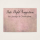 Hier is een leuk accessoire om op te halen voor uw verlovingsfeest of gezamenlijke douche: 's avonds suggestiekaarten waarop gasten persoonlijke notities kunnen schrijven aan de bruid en bruidegom. Op de voorkant lees je "Date Night Suggestions" in een elegant, modern scriptlettertype; dit lettertype is bewerkbaar zodat je een ander kunt kiezen als je wilt... of zelfs een ander bericht kunt schrijven. Hieronder is er een plek voor je namen. Alle woorden worden in zwarte letters weergegeven. Zowel de voor- als de achterkant van de kaart waren bedekt met een subtiel, verdrietig grunge afbeelding met draaiende kanten design en juten, samen met roze en beige elementen. De textuur werd bedekt met een ondoorzichtige witte overlay, bedoeld om het oppervlak lichter te maken en veel contrast te bieden voor de tekst die zowel gedrukt als geschreven op het oppervlak is. De achterkant werd achtergelaten zonder woorden, waardoor er een ruimte is voor langere, persoonlijke handgeschreven notities die uw gasten worden aangemoedigd om te verstrekken. Aarzel niet om contact met mij op te nemen als je speciale verzoeken hebt of andere items nodig hebt. Ik ben ook blij om te helpen met het aanpassen van deze kaarten als je nodig hebt. // Ontworpen door Melody Watson voor Paper Muserie