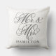 Elegant vierkant accent kussen voor gelukkige paren en newlyweds kenmerkt een zacht zwart manuscript Mr en Mrs. design met douane monogram tekst die met de getrouwde familienaam kan worden gepersonaliseerd. De witte achtergrondkleur kan worden aangepast om met uw huis of slaapkamer decor kleuren te coördineren.