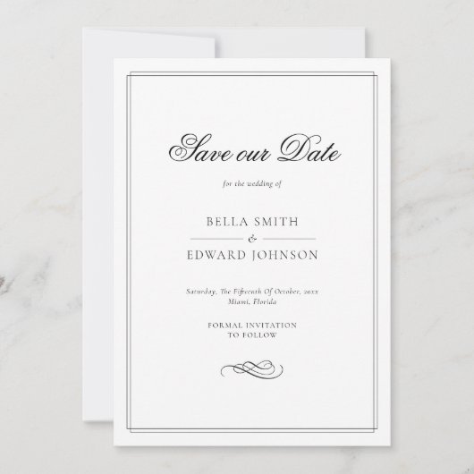 De Elegant zwart-wit save-the-Date Invitation combineert tijdloze typografie en klassieke kalligrafie voor een verfijnde, formele aankondiging. Het minimalistische zwart-witontwerp straalt elegantie uit en is gemakkelijk bewerkbaar om perfect bij uw speciale dag te passen. Voel je vrij om contact op te nemen als je hulp nodig hebt!