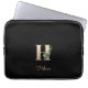 Elegante zwarte laptophoes met een gouden botanische monogram in het midden.