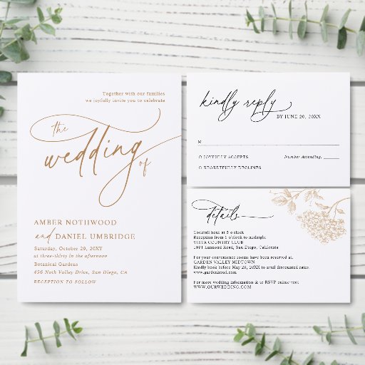 Elegante Gouden Bloemen Modern Script Wedding Kaart