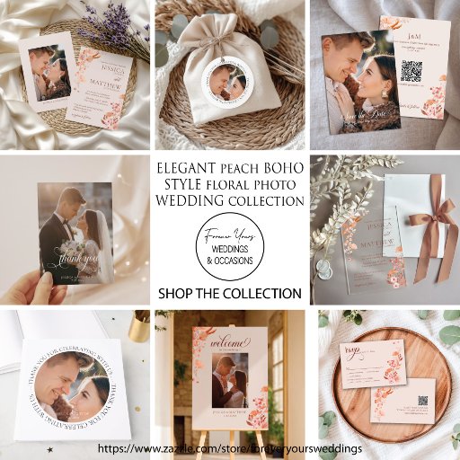 Deze elegante Boho-stijl perzik bloemen RSVP kaart is niet alleen mooi, maar ook modern, waardoor het geschikt is voor elk seizoen. Het beschikt over een QR-code en uw trouwwebsite, samen met delicate perzikbloemen. Het ontwerp is voorzien van een elegante kalligrafie die zowel serif- als sans-serif-lettertypen bevat. Om dit ontwerp aan te passen, klikt u gewoon op "Dit ontwerp personaliseren", voert u uw informatie in en Zazzle zorgt voor de rest. Deze mooie uitnodiging maakt deel uit van het Elegant Peach Boho-Style Floral Photo Wedding Collectie