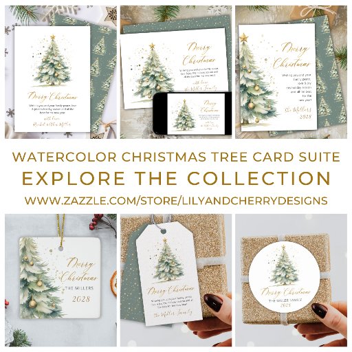 Gold Script Watercolor Christmas Tree Card Suite Ontworpen door Lily and Cherry Designs
