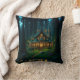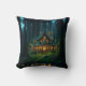 Gooi een kussen van een rustig Tolkienesk Elven kasteel in een sereen bos bij een vijver bij de schemering. Sprookjeslichten verlichten de omgeving. Afbeelding is gemaakt met Leonardo.ai.