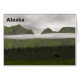 Een digitaal schilderij van groene naaldbomen en bergen in Alaska op een zeer grijze en troebele dag. Een stierenmolen in de voorgrond leent schaal aan de scène. Er verschijnt ook een tekst met de tekst "Alaska".