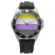 Dit ontwerp kenmerkt de niet-binaire pridevlag, die mensen vertegenwoordigt die zich als niet-binair (ook gespeld nonbinary) of seksqueer identificeren, die een spectrum van geslachtsidentiteiten impliceren die niet uitsluitend mannelijk of vrouwelijk zijn, maar buiten het geslachtsgebonden binaire getal zijn. Niet-binaire identiteiten kunnen herfsten onder de transgender paraplu, aangezien vele niet-binaire mensen zich identificeren met een geslacht dat van hun biologie verschillend is. Een informele term voor niet binair getal is "enby", die afkomstig is van de afkorting NB. Niet-binaire personen kunnen zich identificeren als personen met twee of meer geslachten zonder geslacht, die zich tussen geslachten bewegen, een wisselende geslachtsidentiteit hebben en die het derde geslacht of het andere geslacht zijn.