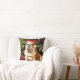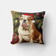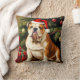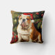 Engelse buldog met zijn kerstmuts, poserend bij de versierde kerstboom.
