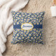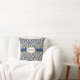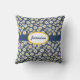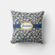 Schattigee, kleine, witte madeliefjes met felgele centra op een blauwe achtergrond creëer een eenvoudig en lief werpkussen. Personaliseer met jouw naam in een ovaal met een gele rand die wordt vastgehouden door een donkerblauwe band.