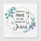 Er is Macht in de Naam van Jezus, dit Christelijke ontwerp is voorzien van een blauw bloemleed met Christelijk tekst gezegde "Er is macht in de naam van Jezus".