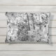 Dit werpkussen heeft een eclectisch abstract dat cirkels van zebrastrepen bevat. De kleuren variëren van grijs (of grijs) tot houtskool tot zwart.