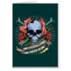 Rots- en rolschedel en crossbones, grafisch met duivelmeisjes, rozen en golvende banners met, "Eternally Grateful" in scriptletters, op een zonnebarstende achtergrond. T-shirts, kaarten, geschenken.
