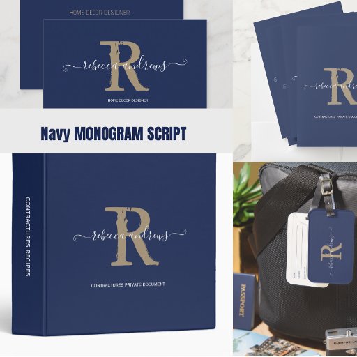 Étiquette À Bagage Élégant Script Marine Gold Monogramme Nom Voyage