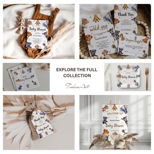 La collection de baby shower sur les animaux de safari est un ensemble charmant qui présente de charmantes illustrations aquarelles de divers animaux adorables. Cette collection comprend des représentations attachantes d'un girafe, d'un éléphant, d'un lion, d'un tigre, d'une autruche, d'un zèbre et d'un singe, tous rendus dans des tons aquarelles doux et vibrants. Chaque animal apporte une touche de fantaisie et de ludicité à la célébration, ce qui la rend parfaite pour une baby shower sur le thème de la jungle.