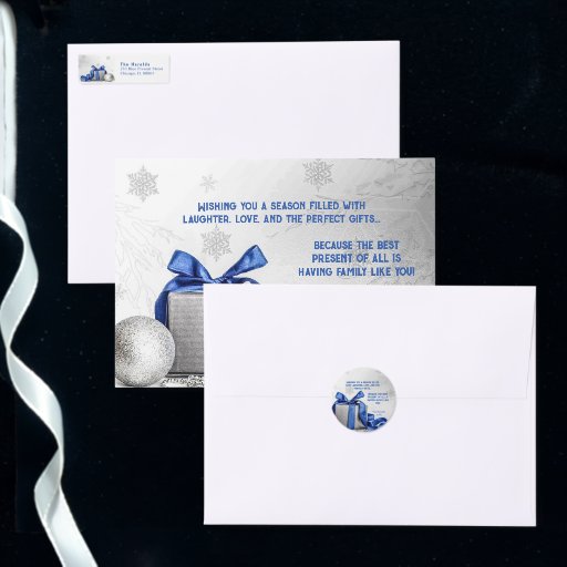 Ce étiquette de adresse de Noël élégant, moderne et tendance dispose d'une boîte cadeau ornée d'un ruban bleu sur un arrière - plan argenté élégant. L'élégant ruban bleu attaché autour de la boîte cadeau se démarque magnifiquement sur le fond argenté brillant, ajoutant une touche de luxe et de classe à tout produit. Cette étiquette chic présente un design charmant et fantaisiste qui reflète parfaitement l'esprit de Noël. Idéal pour ceux qui apprécient l'esthétique raffinée et minimaliste, ces créations s'ajoutent à merveille à vos fêtes festives, offrant une touche chic et moderne à votre saison de vacances. Le étiquette est également très facile à customiser. avec votre adresse. Que vous envoyiez des voeux chaleureux ou des salutations de vacances, ce étiquette est sûr d'apporter un sourire au visage de quiconque.