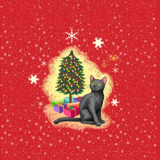 C'est un joli design de Noël avec un arrière - plan rouge vif plein d'étoiles et de minuscules flocons de neige et avec un beau chat devant un sapin de Noël. Envoyez à vos proches vos vibes d'amour, douillettes et festives !