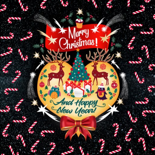 C'est un design de Noël joyeux avec des éléments ludiques, cerf, hibou, pingouin, arbre de Noël, mistletoe, cupcake, étoiles, cadeaux, arc, un grand coeur doré et un souhait spécial pour une Bonne Année.
