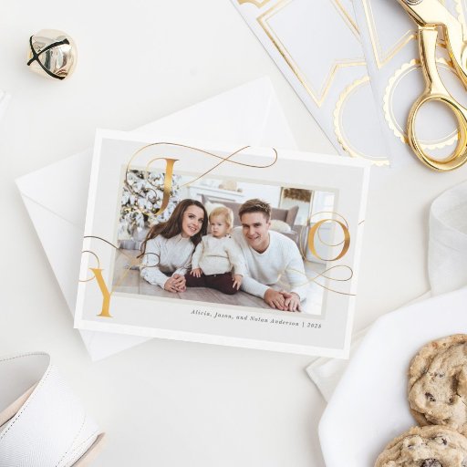 Célébrez la saison avec cette luxueuse carte de vacances "Joy", avec un design stylisé de typographie de feuille d'or et des tourbillons élégants encadrant une photo de famille chère dans une palette douce, blanche et ivoire. La mise en page sophistiquée met en évidence le mot "JOY" en lettres gracieuses et fluides, ce qui en fait un bel élément central pour vos salutations de vacances. Faisant partie d'une collection de vacances cohésive, ce design est également disponible sur des étiquettes cadeaux assorties, des enveloppes, et plus encore, vous permettant de créer un look coordonné et poli pour toute votre correspondance de vacances. Parfait pour partager la chaleur festive et l'élégance avec vos amis et votre famille.