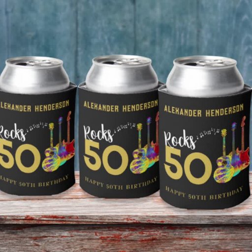 Ajouter personnalisé nom Rocks 50 or typographie moderne 50e anniversaire vin étiquettes avec notes musicales et trois cool psychédéliques de guitare coloré design sur arrière - plan noir. Guitare électrique, guitare acoustique et guitare acoustique illustration de couleurs vives. Ce modèle facile à utiliser pour changer d'âge et de nom crée le étiquette de vin de fête parfait pour célébrer cinquante en style rock n roll et est idéal pour un guitariste, musicien et mélomane amoureux. Ce design cool d'instruments de musique moderne célèbre l'énergie musicale de ce merveilleux instrument de musique et est la façon parfaite de faire du rock une célébration du cinquantième anniversaire. OEuvre originale de l'artiste Catherine Sweetman