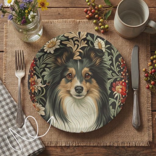 Charming illustration of a sweet Sheltie or Shetland Sheepdog in an old English garden in the style of William Morris.