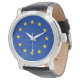 Blauwe vlag met gele sterren. Officiële vlag van de Europese Unie. Grote geschenken en koopwaar onder EU-vlag.
