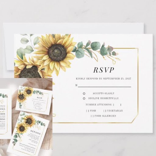 Creëer een moderne zonnebloem-Floral-rsvp-kaart met deze leuke sjabloon met prachtige rustige florale bouquet, geometrisch goudvormig lijst, met moderne eenvoudige typografie. TIP: Overeenkomende trouwsuite-kaarten zoals RSVP, trouwprogramma's, banners, tapestry, cadeaubonnen, labels, borden en andere bruiloft-keepsakes en -godies zijn beschikbaar in het collectie hieronder met dit ontwerp.