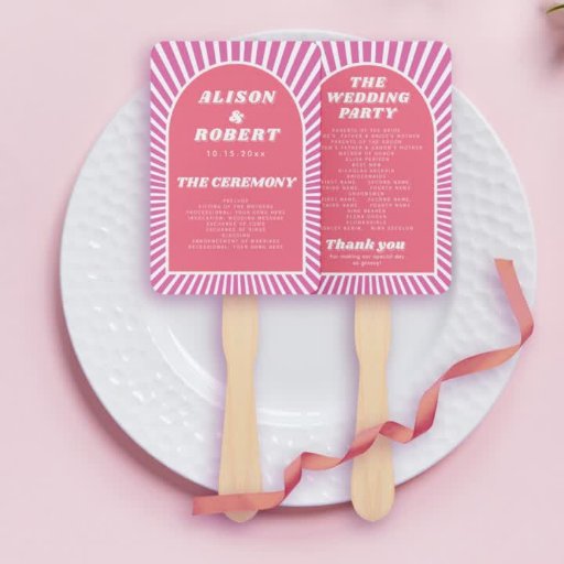 Ce ventilateur sophistiqué de programme de mariage est le moyen parfait pour transmettre les détails de votre journée spéciale dans le style. Il est conçu avec un cadre en arc que vous pouvez customiser avec le texte de votre choix et derrière il est un design lumineux et attrayant des rayons de soleil rose et blanc, qui lui donnent une ambiance rétro super incomparable. Ce ventilateur à main du programme de mariage est une solution idéale pour garder vos invités cool tout en ajoutant une touche de flair à votre grand jour. La couverture a été conçue à l'aide de certains actifs de Freepik.com