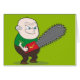 Dit is een cartoon illustratie van een ouder gedurfd man dat een beetje boos op zijn kettingzaag is. Laten we hopen dat hij alleen maar van plan is om een boom af te snijden en niets meer kwaad!