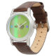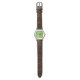 eWatch heeft een bruine polsband, groen metallic gezicht met Honey Bees Sound Waves en Flowers op 12-3-6-9.