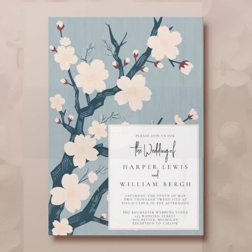 Élever votre mariage avec cette invitation vintage contemporaine, avec un arbre stylisé en fleurs de cerisier sur un arrière - plan bleu clair texturé. Le revers présente un motif d'inspiration japonaise dans le bleu clair assorti, ajoutant une touche d'élégance à votre célébration sur le thème japonais.