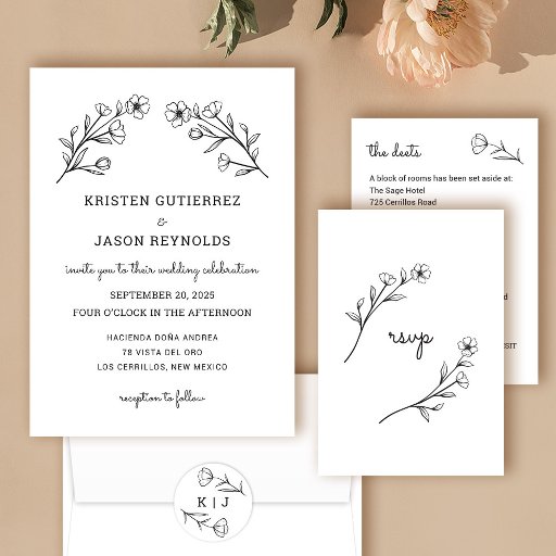 Une faire-part de mariage simple et sucrée. Comprend des éléments botaniques dessinés à la main dans une étonnante couleur rose chaud. Reportez-vous aux autres éléments correspondants de la collection Mariage Fleur sauvage.