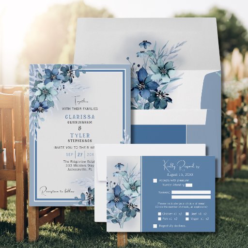 Joli faire-part de mariage floral bleu, facilement mis à jour avec vos détails.